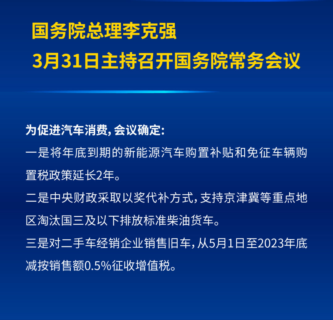 為促進汽車消費,會議確定,一是將年底到期的新能源汽車購置補貼和免征車輛購置稅政策延長2年。二是中央財政采取以獎代補方式,支持京津冀等重點地區淘汰國三及以下排放標準柴油貨車。三是對二手車經銷企業銷售舊車,從5月1日至2023年底減按銷售額0.5%征收增值稅。